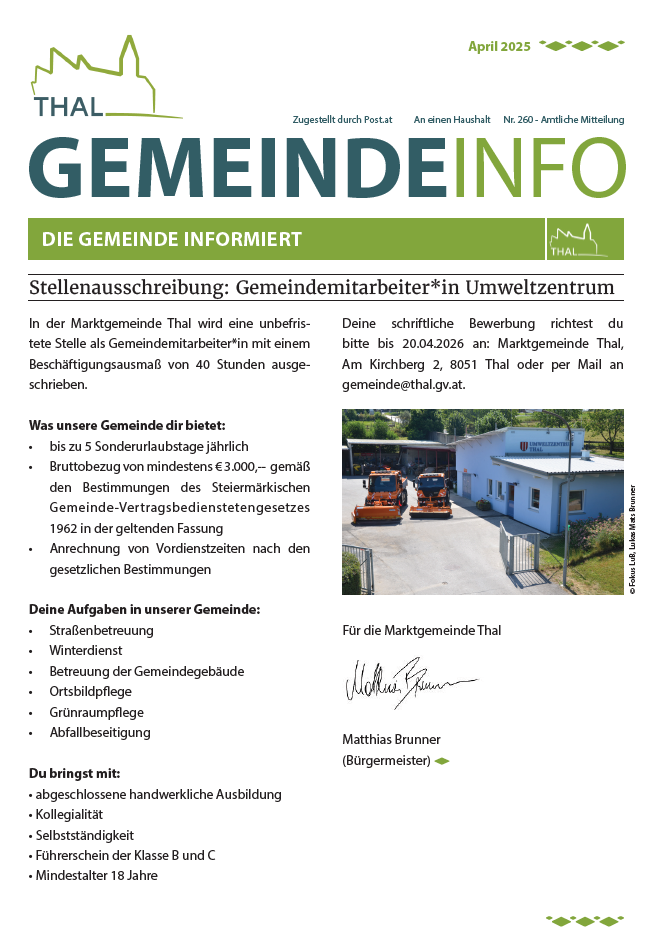 Copyright © 2017 Marktgemeinde Thal | Impressum | Datenschutz | Agentur: wurzinger design | Website: WESEO Internetagentur